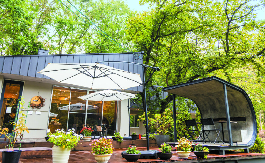 使用する食材にこだわり、旬の食材を使った身体にも優しい色とりどりのケーキが常時10種類以上ショーケースに並び、焼き菓子も20種類揃います。そして、茶色を基調としたシックなデザインの心が休まるカフェスペースでは、季節ごとに内容が変わるパフェやデセールが味わえます。建物の周りは木々に囲まれ、店内やワンちゃんも一緒に過ごせるテラス席からは四季折々の軽井沢が楽しむことができ、心もお腹も満たされる場所になっています。